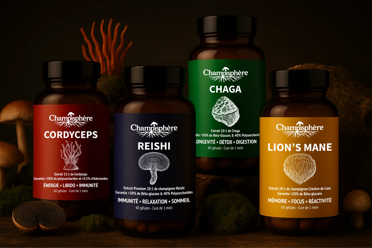 Boostez votre rentrée avec nos compléments alimentaires à base de champignons adaptogènes. Lion's Mane pour le cerveau, Reishi pour le sommeil et le stress, Chaga pour l'immunité et la digestion et le Cordyceps pour l'énergie !